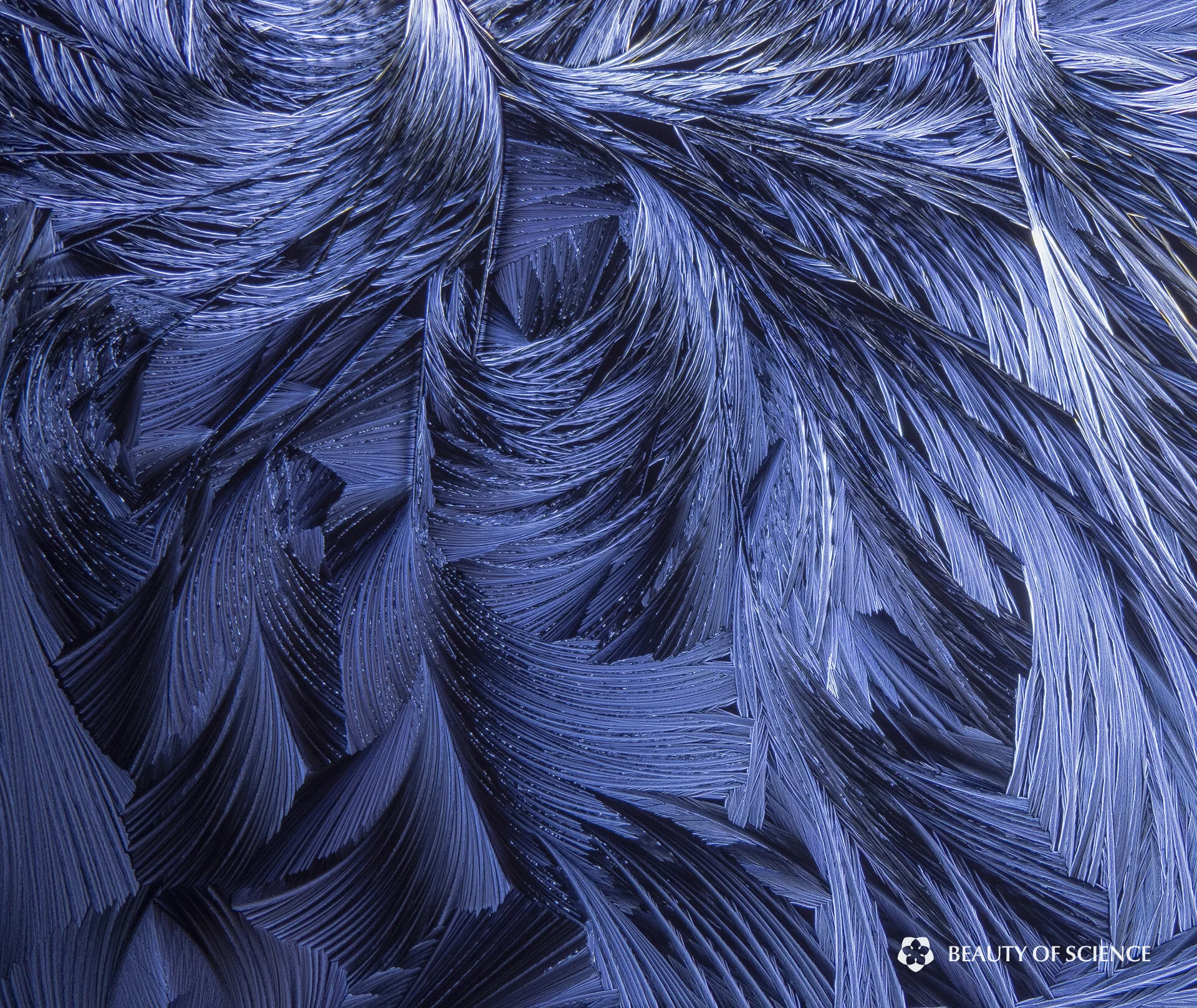THE VIBRANCY uses polarized light microscopy to capture the fascinating crystallization processes of various substances. The artist explores the creative potential of nature by combining different organic solutions, creating painterly crystalline images under the microscope. Droplets of organic solution spread across a 5-centimeter glass surface, with crystals slowly forming over time. Through the polarized light microscope, the crystals resemble flowers blooming and plants growing in the darkness, revealing a marvelous scene brimming with vibrant life energy.